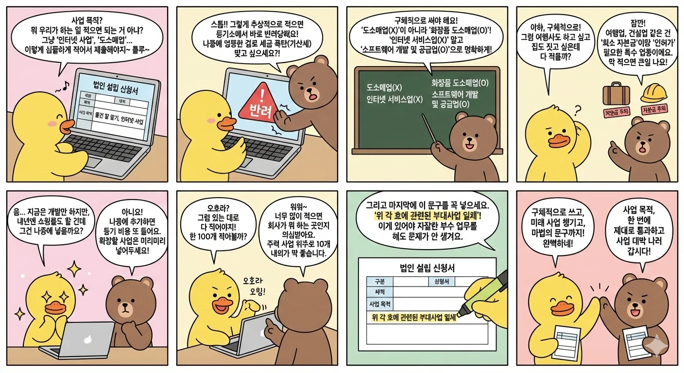 사업 목적은 “일단 통과만 되면 되는 항목”이 아니라, 설립 이후 사업자등록, 인허가, 세무 처리, 사업 확장까지 계속 영향을 미치는 기준이라는 점을 꼭 기억하셔야 합니다.